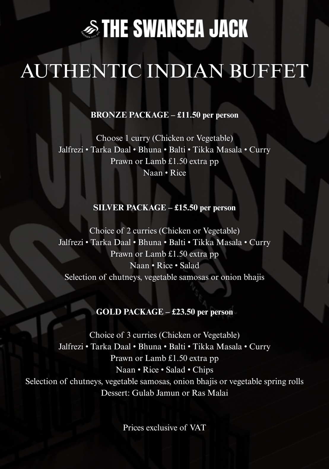 At The Swansea Jack, we offer both an Authentic Indian Buffet and a classic English Buffet, giving you the best of both worlds. Whether it’s matchday, a private event, or a group booking, our buffet options are designed to be flavour-packed, satisfying, and easy to enjoy.